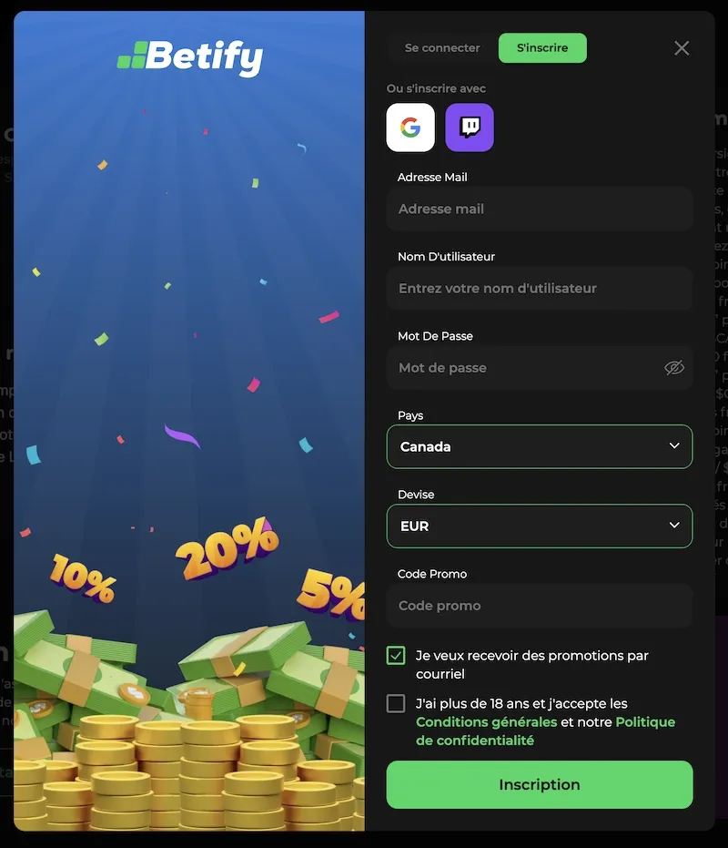 Aby utworzyć konto, wejdź na stronę kasyna Betify i kliknij „Rejestracja” lub „Załóż konto”. Następnie uzupełnij formularz, podając podstawowe dane, takie jak e-mail, hasło i data urodzenia. Dane muszą być prawdziwe, ponieważ mogą zostać zweryfikowane później.