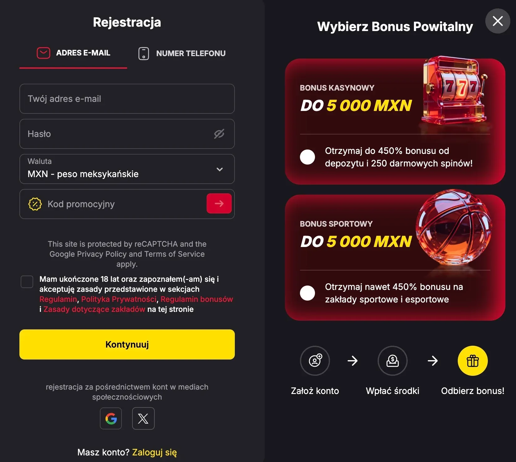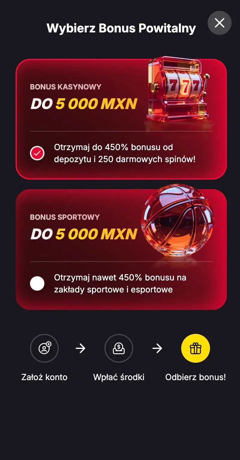 Po wprowadzeniu kodu promocyjnego system automatycznie powinien zaproponować Ci dedykowany, ulepszony bonus powitalny. Upewnij się, że jest on zaznaczony, aby skorzystać z pełnej oferty sięgającej 8 450 PLN i 250 darmowych spinów.