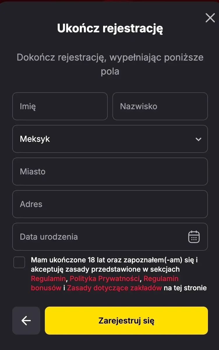 Uzupełnij wymagane pola w formularzu, podając prawdziwe i dokładne dane osobowe, takie jak imię, nazwisko, data urodzenia i adres. Pamiętaj, że dane te będą później weryfikowane podczas procedury KYC (Know Your Customer), a ich poprawność jest kluczowa dla pomyślnej wypłaty przyszłych wygranych.